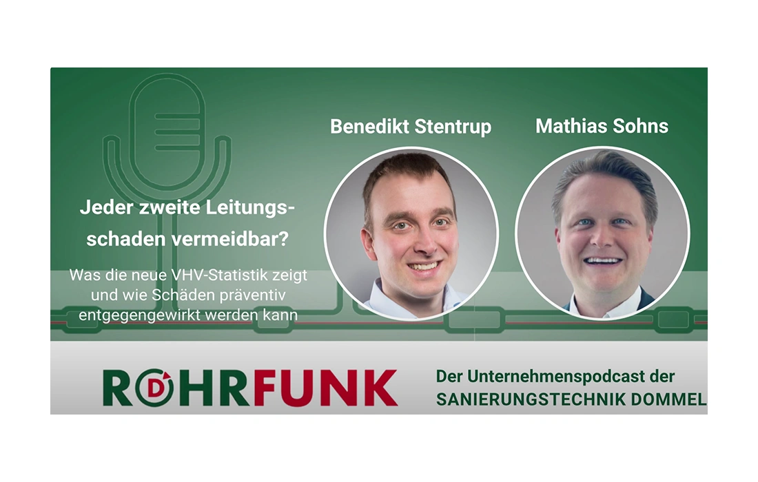 Der VHV-Bauschadenbericht Tiefbau 2022/2023 zeigt, dass jeder zweite Tiefbauschaden ein Rohrleitungsschaden ist. Die Gründe dafür sowie passende Gegenmaßnahmen erläutert Mathias Sohns, Leiter Bau-Schaden bei der VHV Allgemeine und Experte für Leitungsschäden, in einer neuen Folge des Rohrfunk-Podcasts der Sanierungstechnik DOMMEL GmbH.